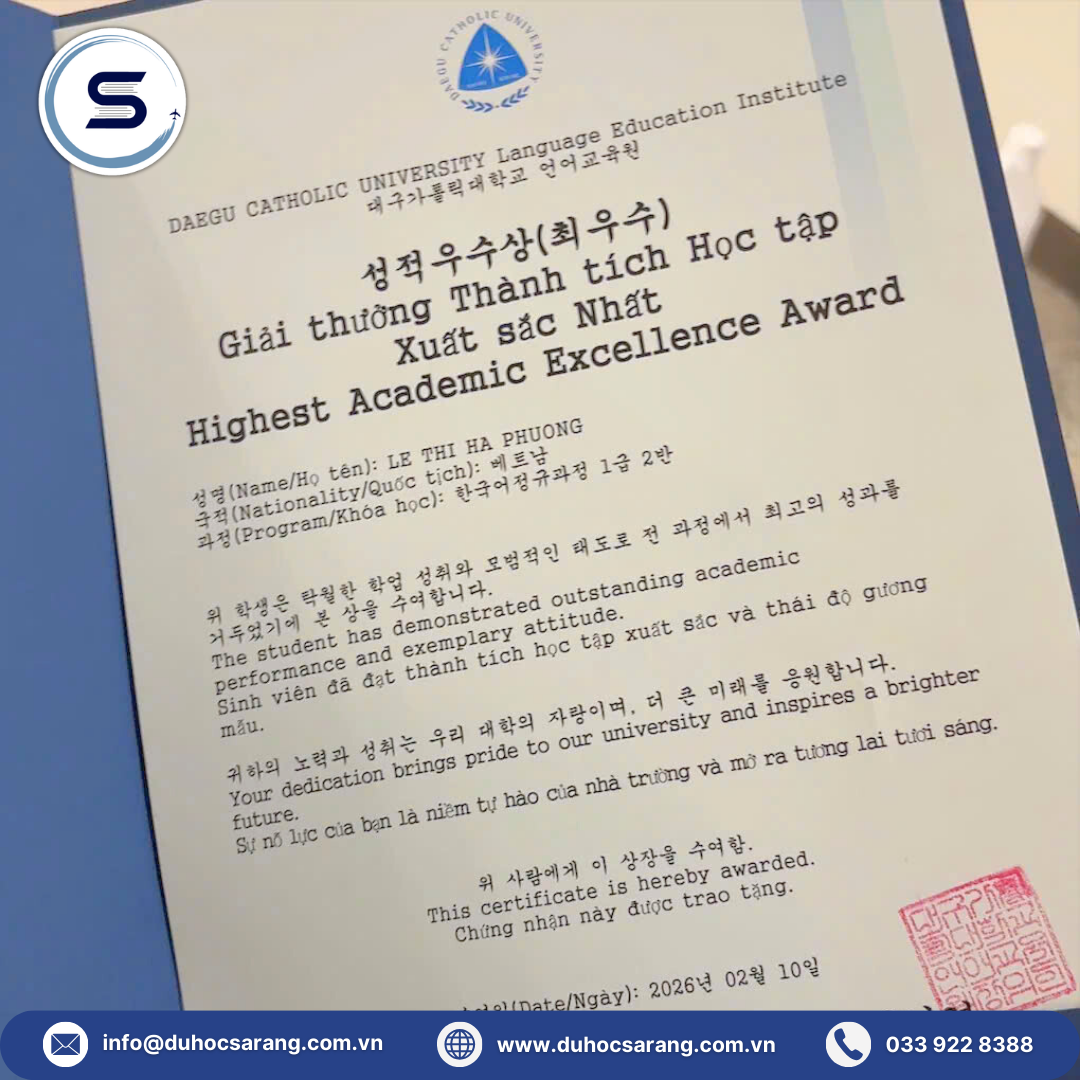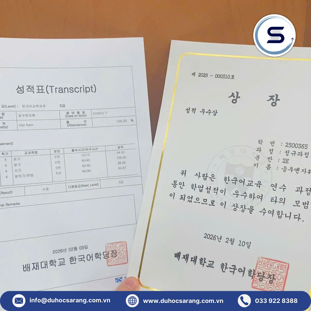 Du học là hành trình nhiều thử thách. Các chiến binh Sarang đã chứng minh bản lĩnh bằng những bằng khen thành tích học tập tại Hàn Quốc. Đây là kết quả của sự nỗ lực bền bỉ và định hướng đúng ngay từ đầu.Những tấm bằng khen thành tích học tập không chỉ là phần thưởng cá nhân. Đó còn là niềm tự hào của gia đình và tập thể Sarang.