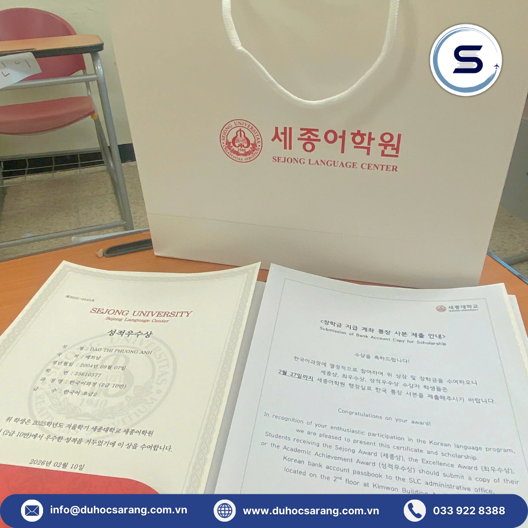 Nếu bạn đang ấp ủ giấc mơ du học Hàn Quốc, hãy bắt đầu với một nền tảng vững chắc. Sarang sẽ đồng hành cùng bạn trên hành trình chinh phục những bằng khen thành tích học tập trong tương lai.
