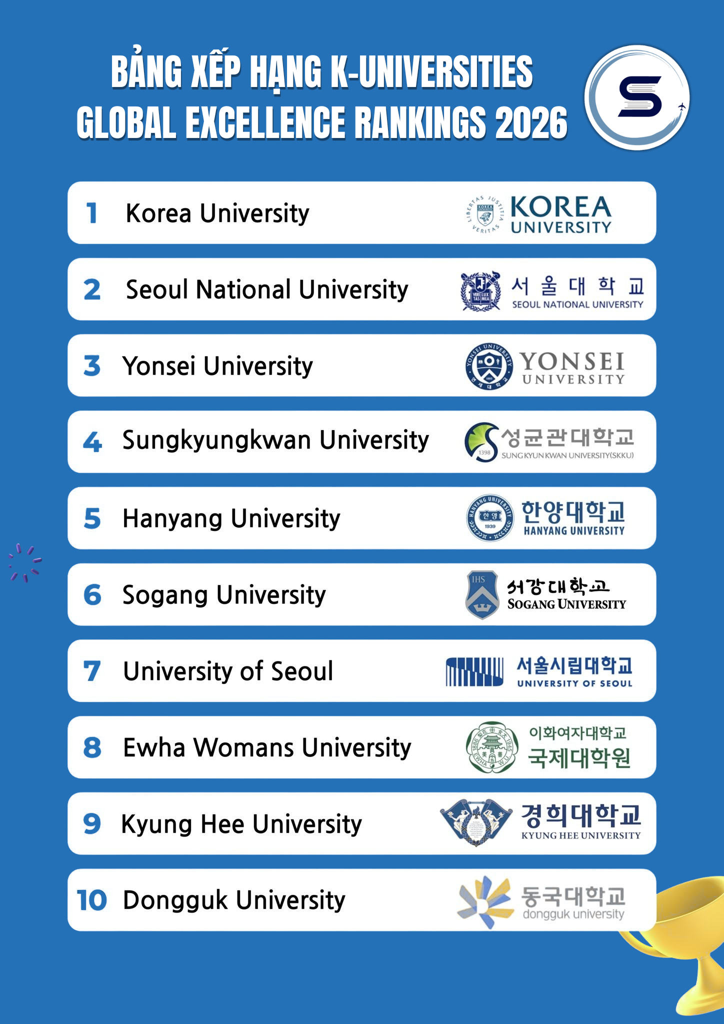 Dựa vào K-UNIVERSITIES GLOBAL EXCELLENCE RANKINGS 2026, học sinh có thể xác định nhóm trường phù hợp với hồ sơ hiện tại, từ đó xây dựng kế hoạch học tập và tài chính hợp lý.