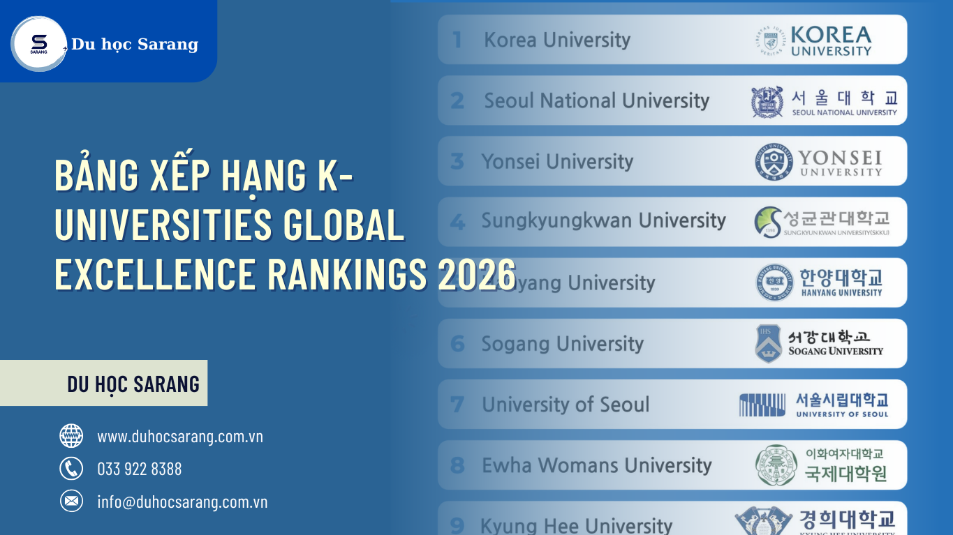 K-UNIVERSITIES GLOBAL EXCELLENCE RANKINGS 2026 là công cụ tham khảo hữu ích giúp học sinh và phụ huynh lựa chọn trường đại học phù hợp khi du học Hàn Quốc. Nếu bạn cần tư vấn chi tiết theo năng lực cá nhân và mục tiêu dài hạn dựa trên K-UNIVERSITIES GLOBAL EXCELLENCE RANKINGS 2026, Du học Sarang luôn sẵn sàng hỗ trợ tận tâm và chính xác.