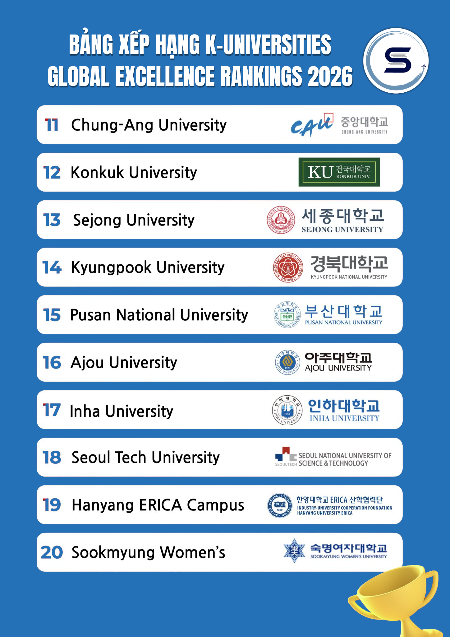 Du học Sarang luôn cập nhật K-UNIVERSITIES GLOBAL EXCELLENCE RANKINGS 2026 để tư vấn chọn trường, ngành học và lộ trình phù hợp cho từng học sinh. Với kinh nghiệm xử lý nhiều hồ sơ du học Hàn Quốc, Sarang cam kết đồng hành từ bước chuẩn bị hồ sơ đến khi bay an toàn.