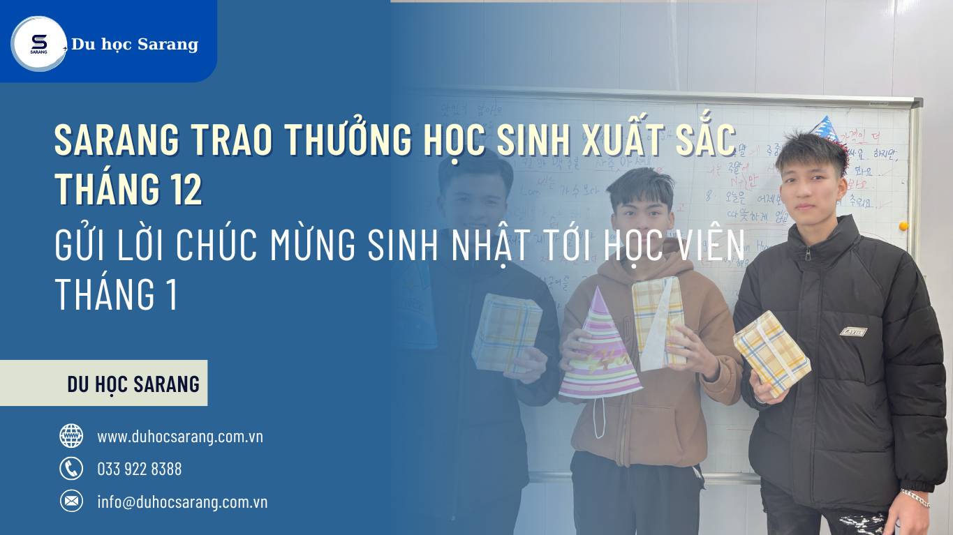 09 Th1 Sự kiện Sarang, Tin Tức SARANG TRAO THƯỞNG HỌC SINH XUẤT SẮC THÁNG 12 & GỬI LỜI CHÚC MỪNG SINH NHẬT TỚI HỌC VIÊN THÁNG 1 9 Tháng Một, 2026 By adminsarang Trong hành trình chinh phục giấc mơ du học Hàn Quốc, mỗi sự cố gắng đều xứng đáng được ghi nhận. Hoạt động trao thưởng học sinh xuất sắ... Xem chi tiết