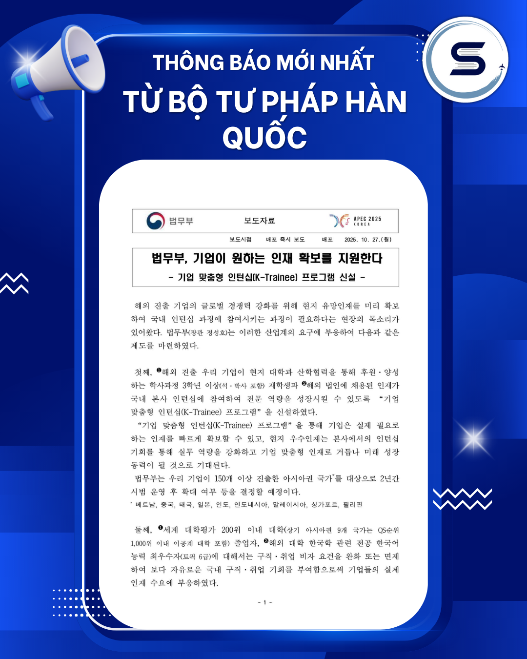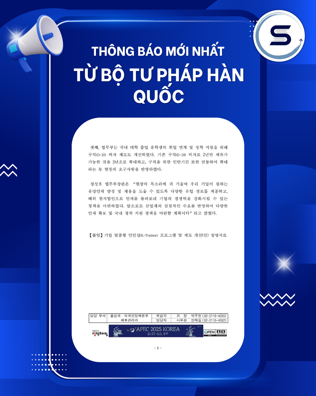 Ngày 27/10/2025, Bộ Tư pháp Hàn Quốc (법무부) đã chính thức công bố quyết định mở rộng thời gian lưu trú của visa D10 (visa tìm việc) từ tối đa 2 năm lên 3 năm, có hiệu lực từ ngày 29/10/2025.
