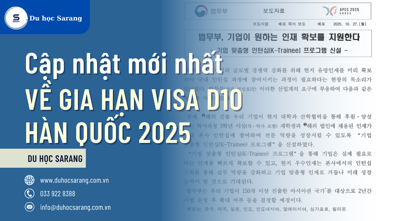 Nếu bạn cần tư vấn chi tiết về thủ tục gia hạn visa D10 Hàn Quốc 2025, hãy liên hệ ngay với Sarang để được hướng dẫn cụ thể và cập nhật sớm nhất các thay đổi từ Cục Xuất nhập cảnh Hàn Quốc.