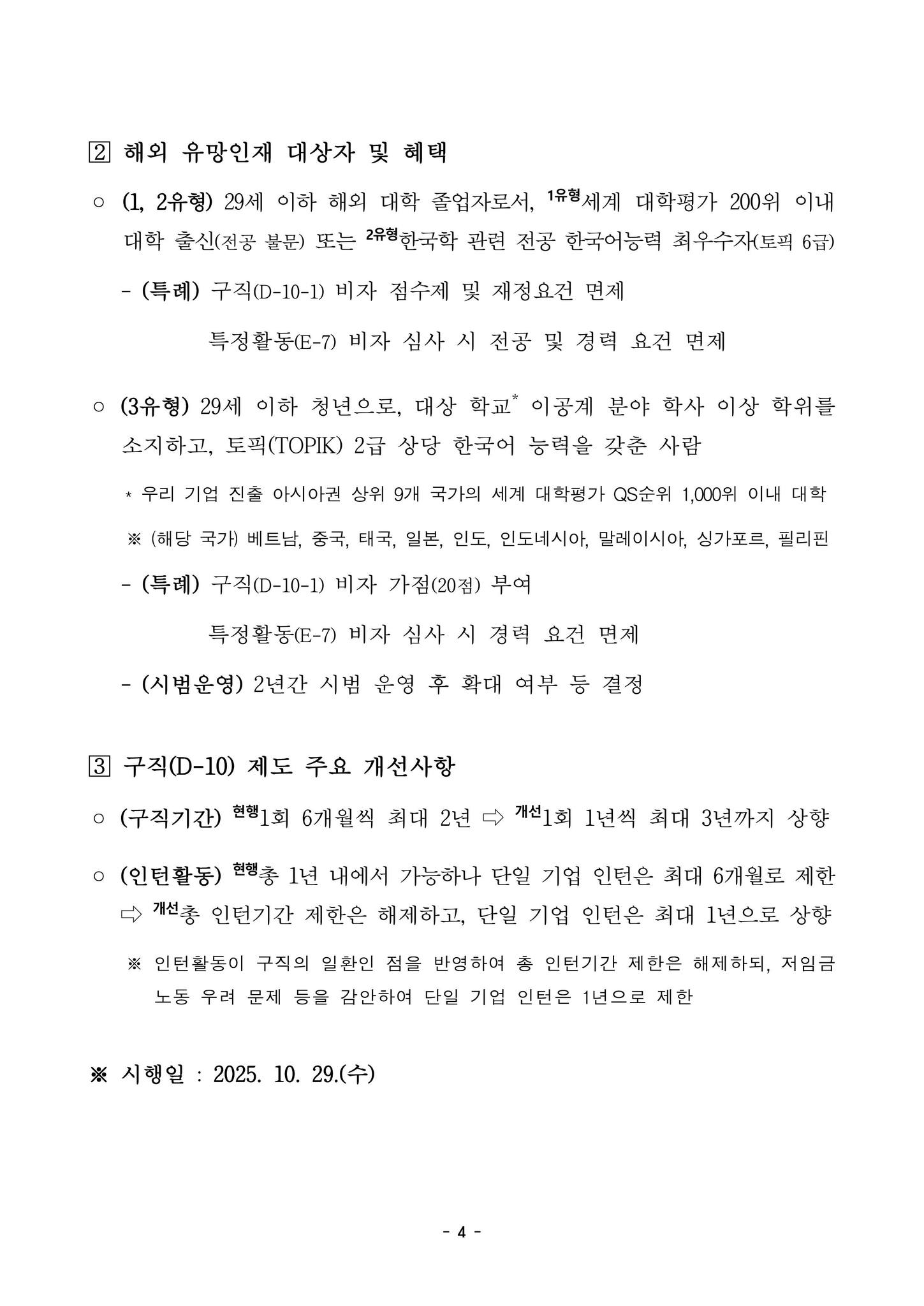 • Đối tượng áp dụng: Toàn bộ người nước ngoài đang hoặc sẽ đăng ký visa D10 tại Hàn Quốc (bao gồm du học sinh tốt nghiệp đại học, thạc sĩ, tiến sĩ).