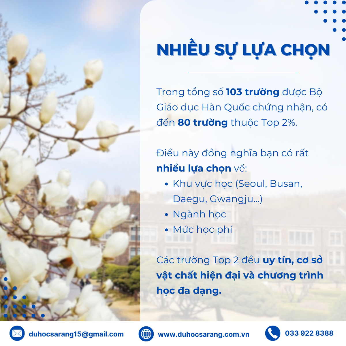 Giữa rất nhiều lựa chọn, việc chọn đúng trường và đúng đơn vị tư vấn là yếu tố quyết định đến 70% thành công của hành trình du học. Tại Sarang, chúng tôi luôn ưu tiên tư vấn Trường Top 2% Hàn Quốc cho học viên bởi: